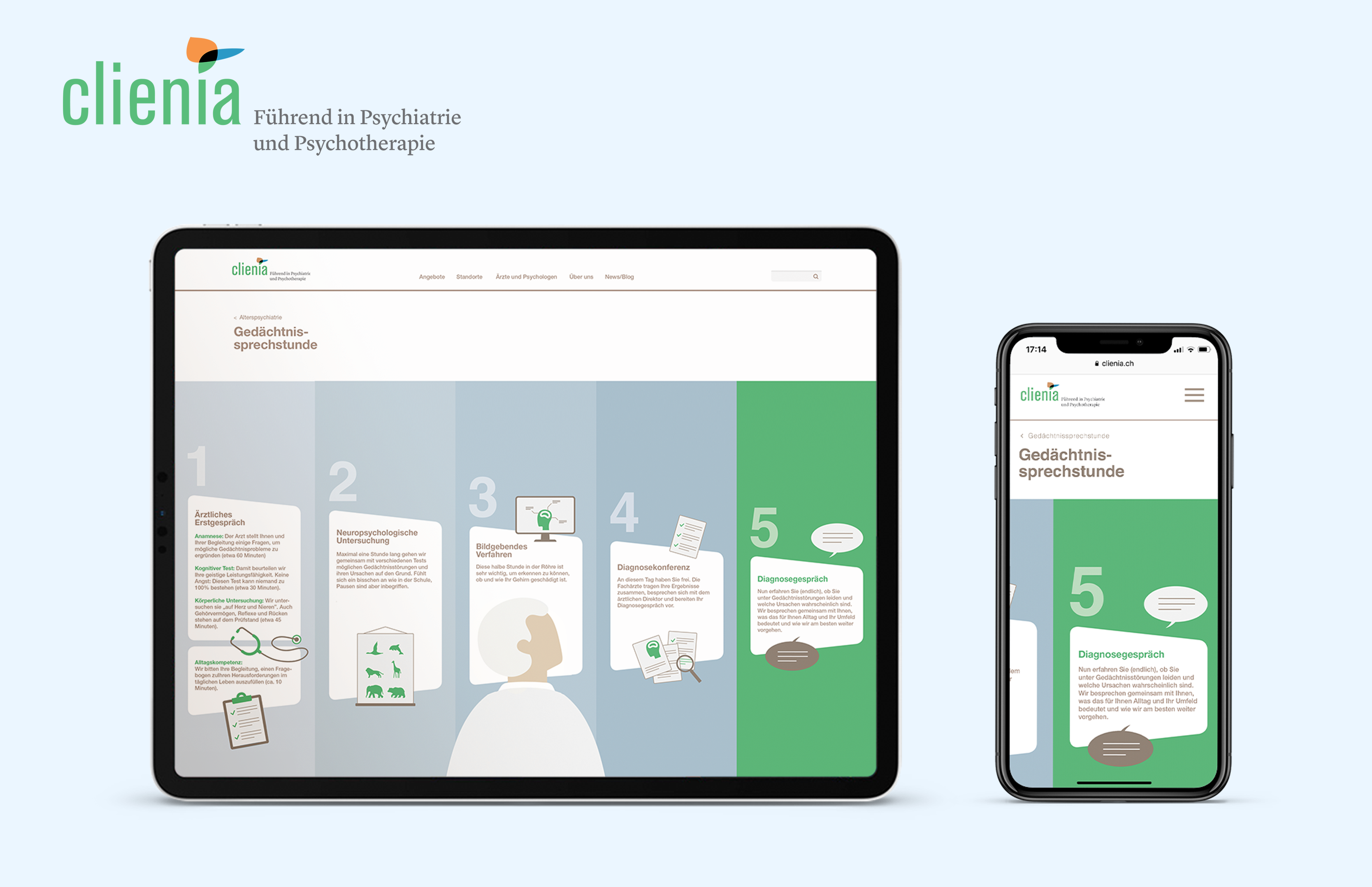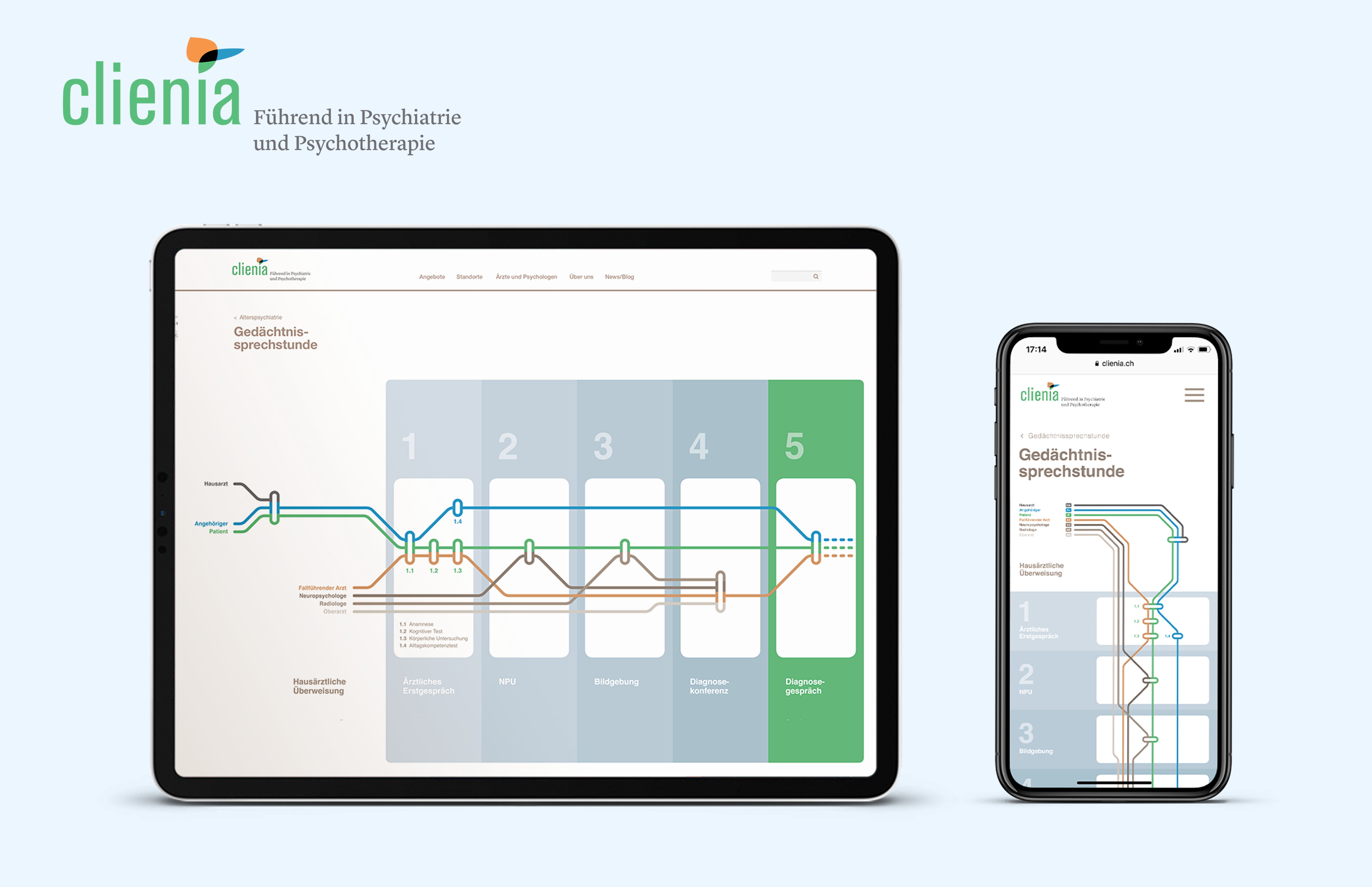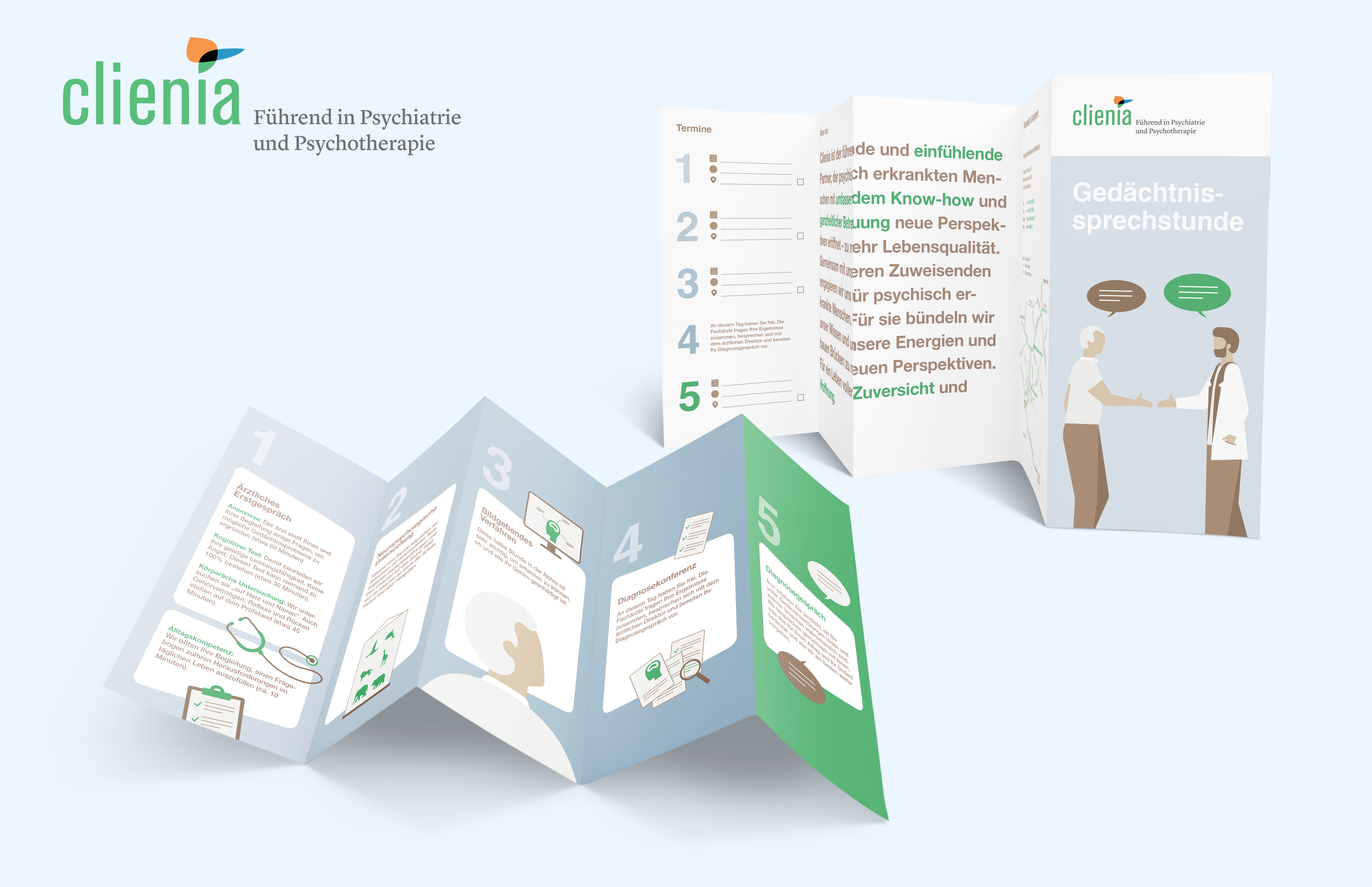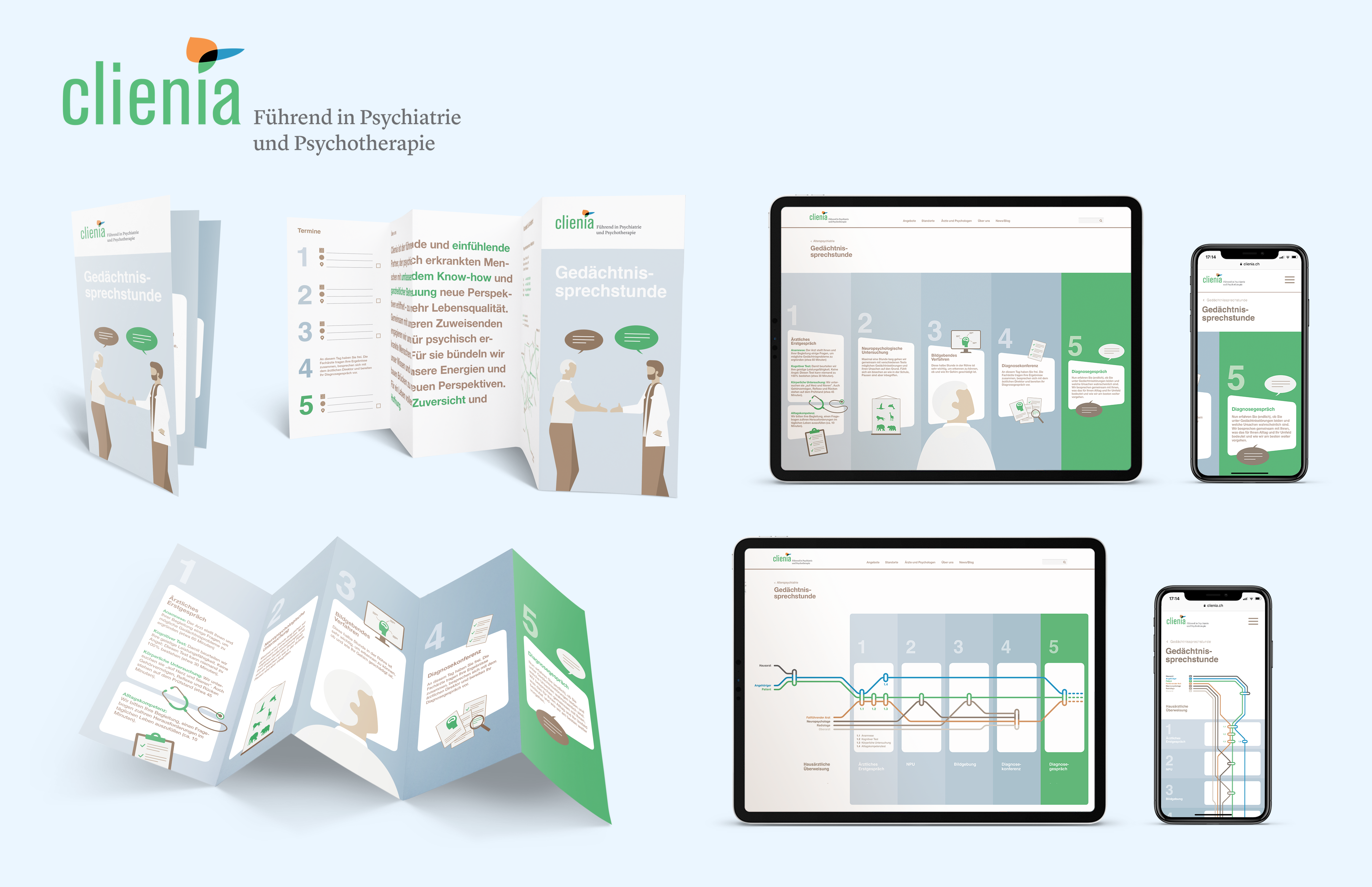An information package created for Clienia, a private memory clinic in Switzerland, to help guide patients and their companions through the care process, from anamnesis to diagnostic interviews.