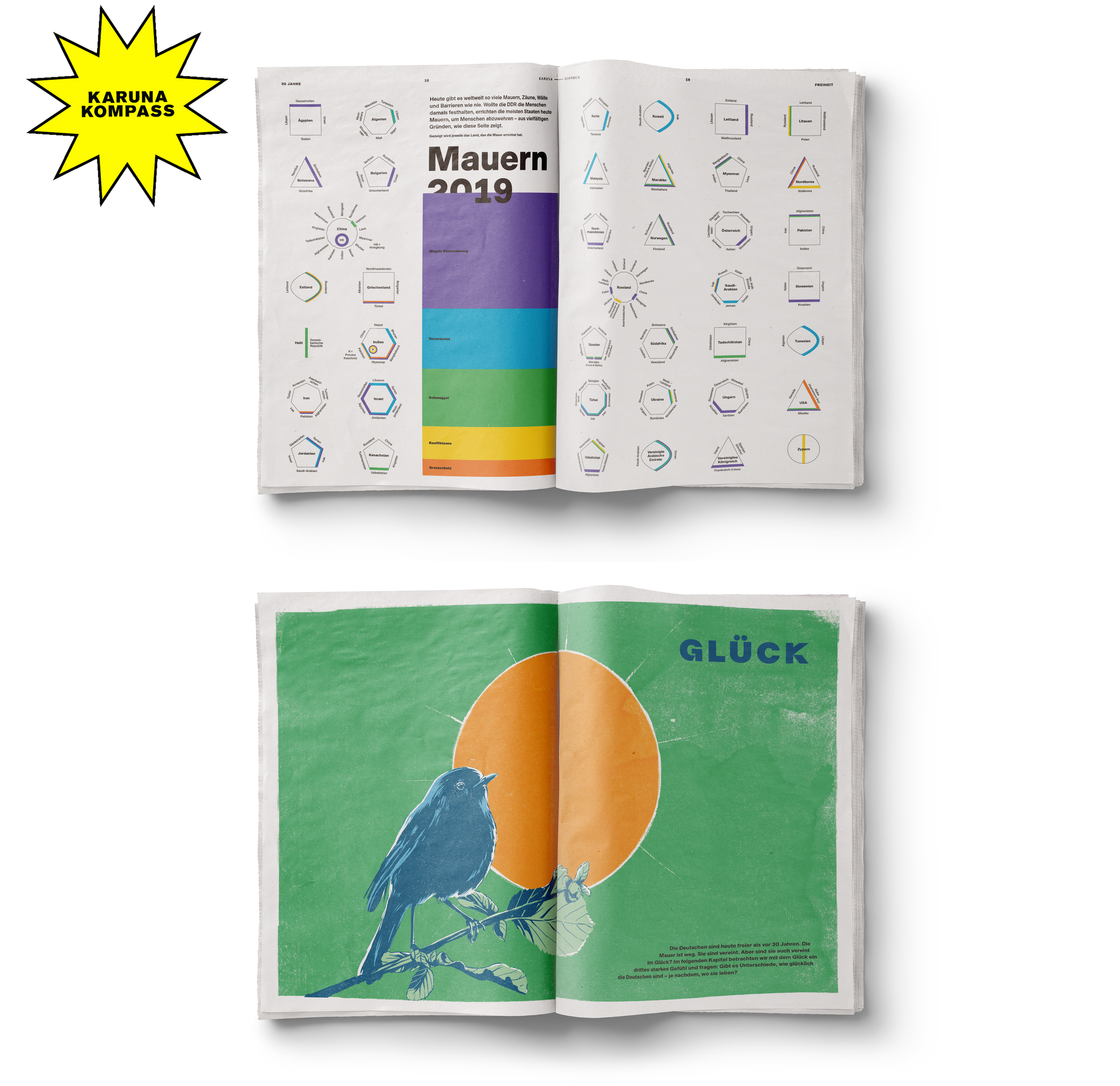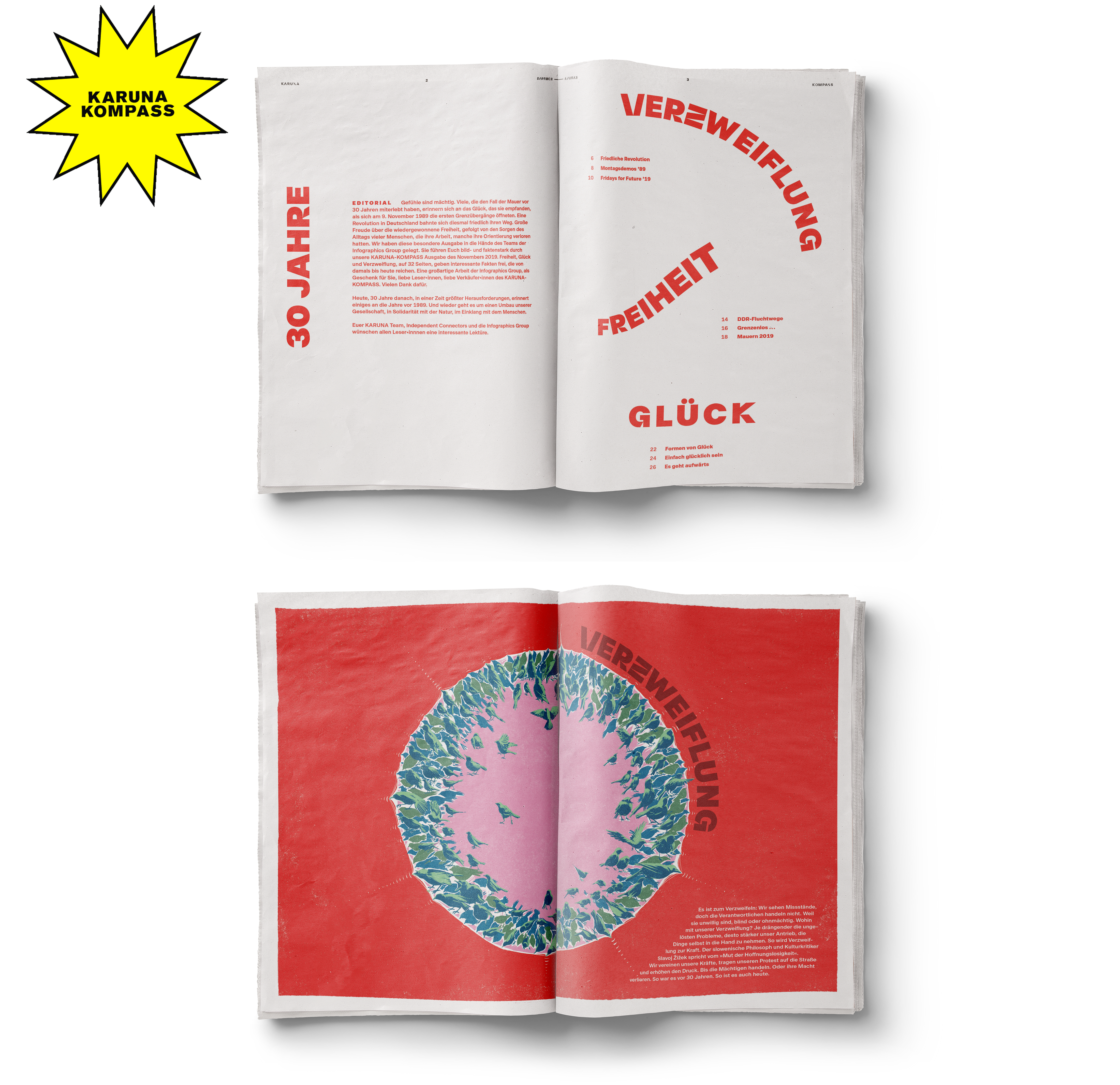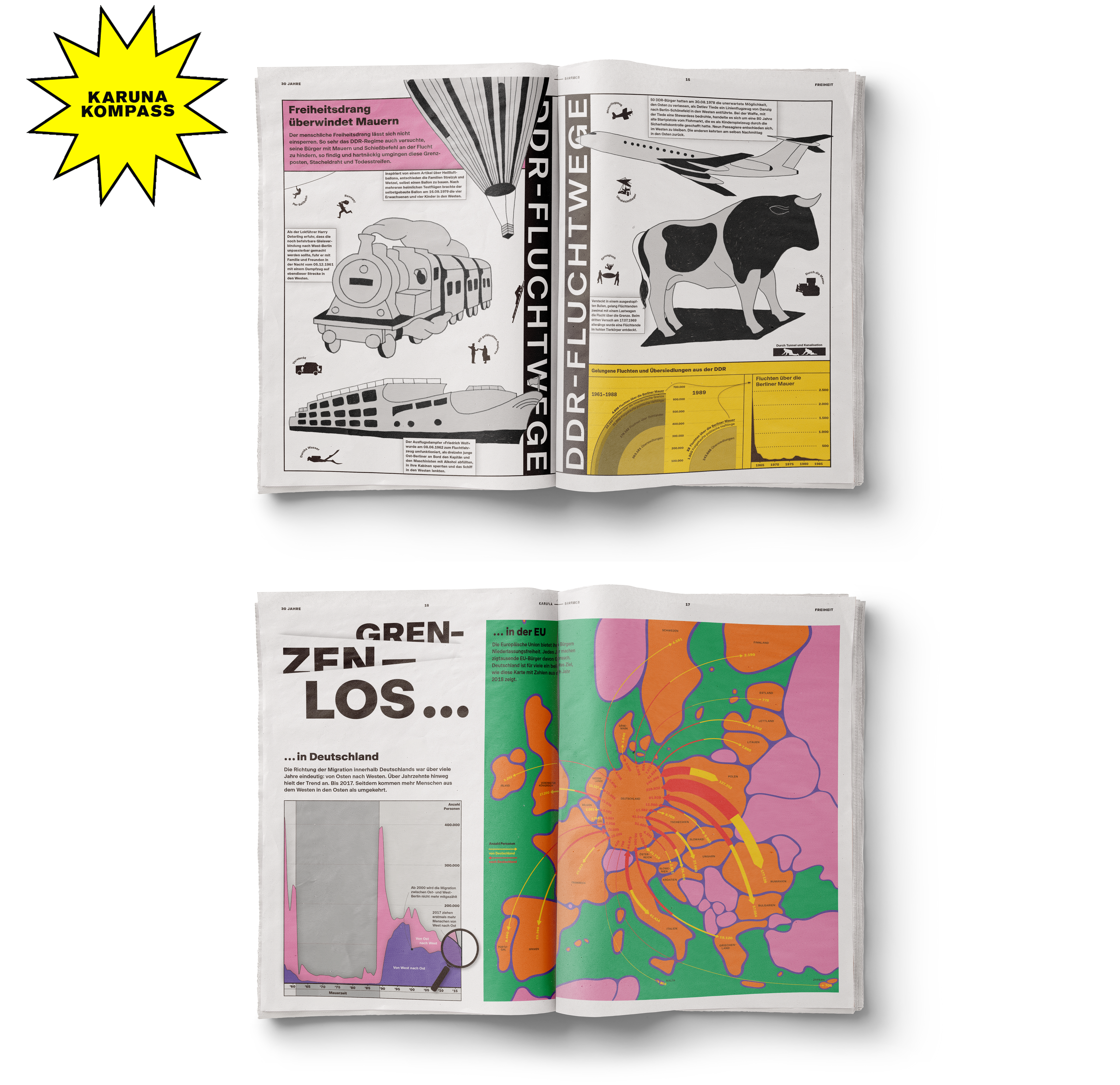 An infographic project with the Berlin street magazine KARUNA KOMPASS at Infographics Group, created to mark the 30th anniversary of the fall of the Berlin Wall. The publication explores a range of topics related to this historic milestone, including the Monday demonstrations, creative escape methods from the DDR, migration patterns in and out of Germany, existing walls around the world, the happiness index across German federal states, the impact of happiness on individuals, and the evolution of German satisfaction levels from the early 2000s to the present.