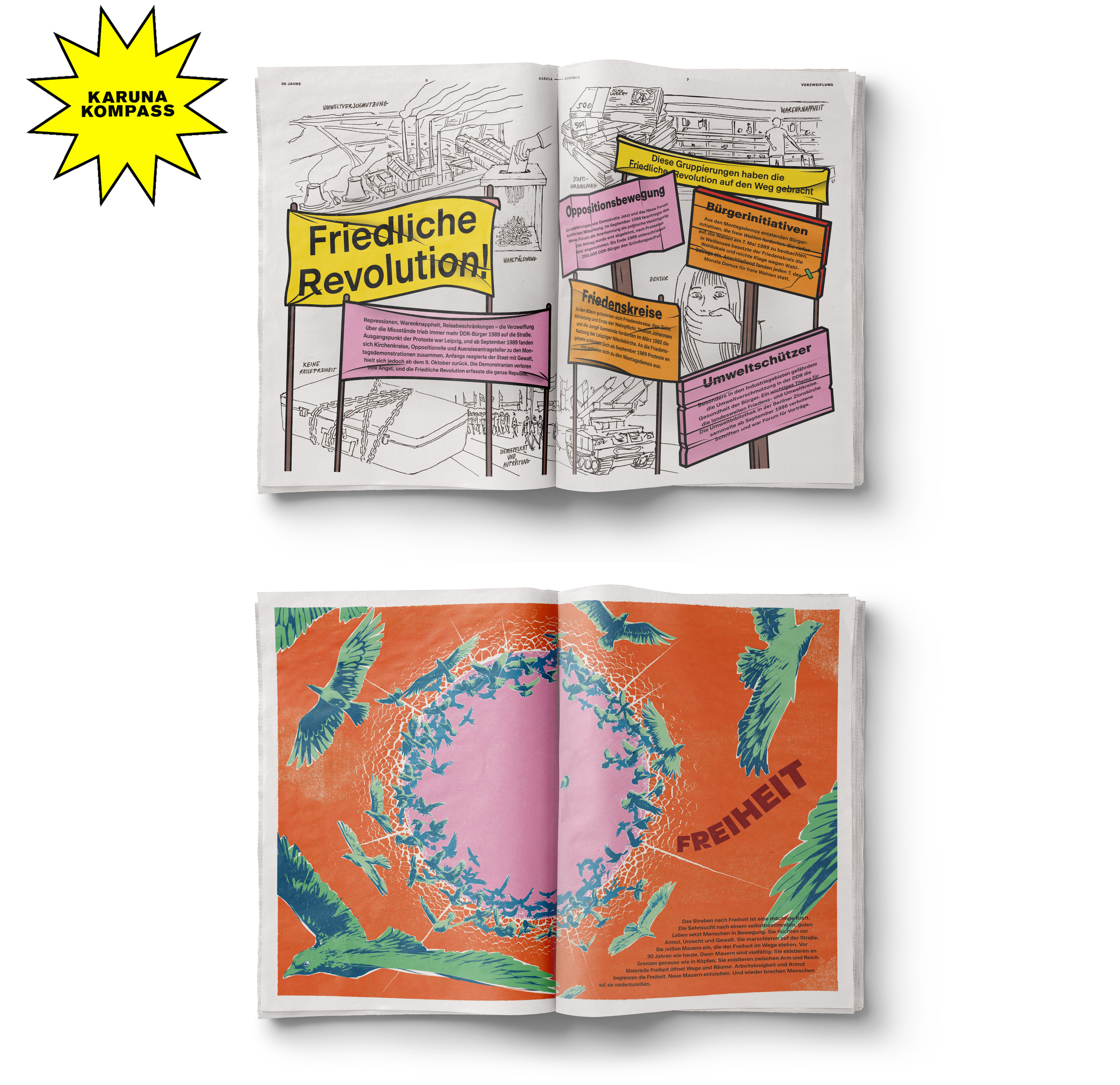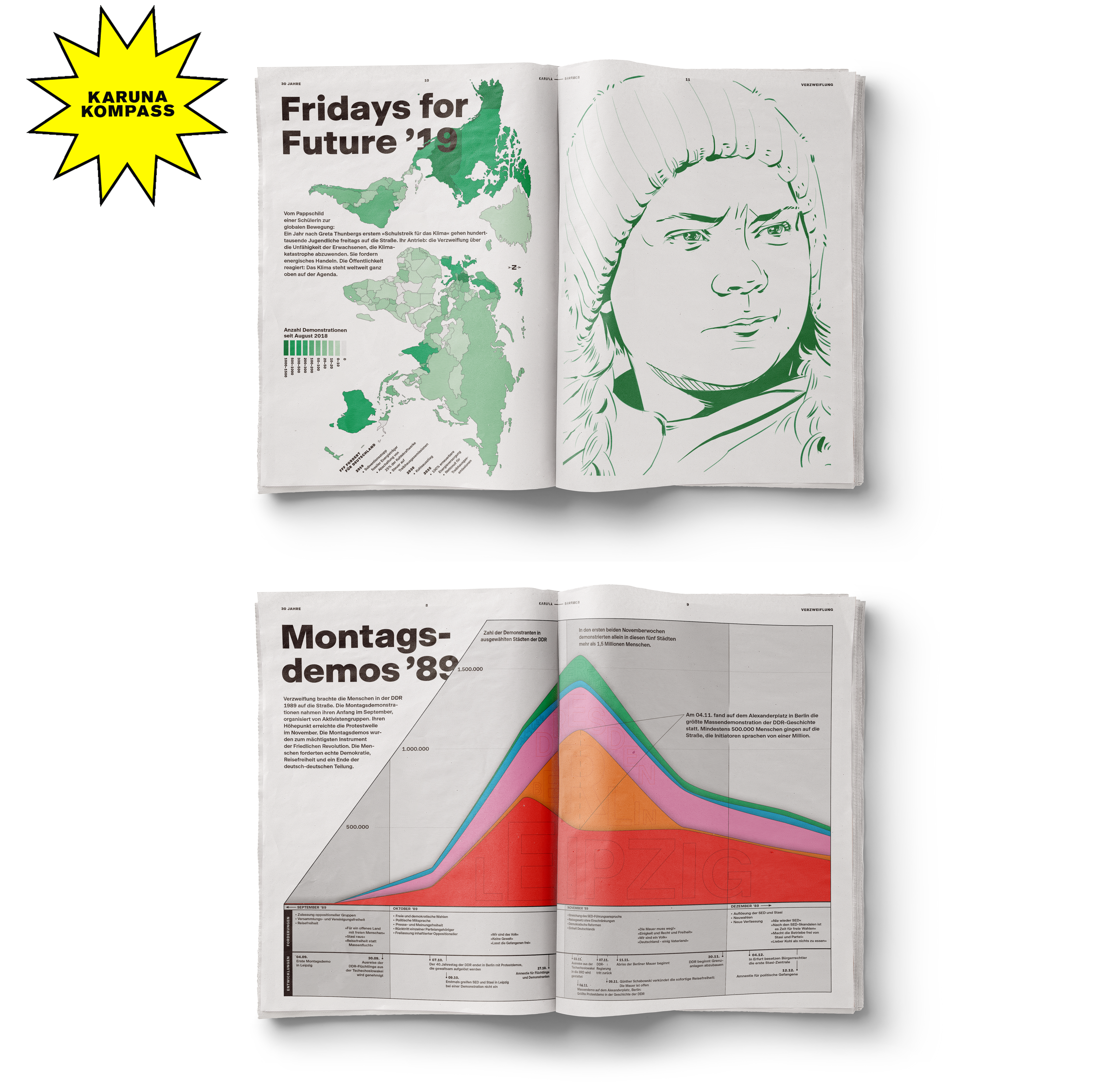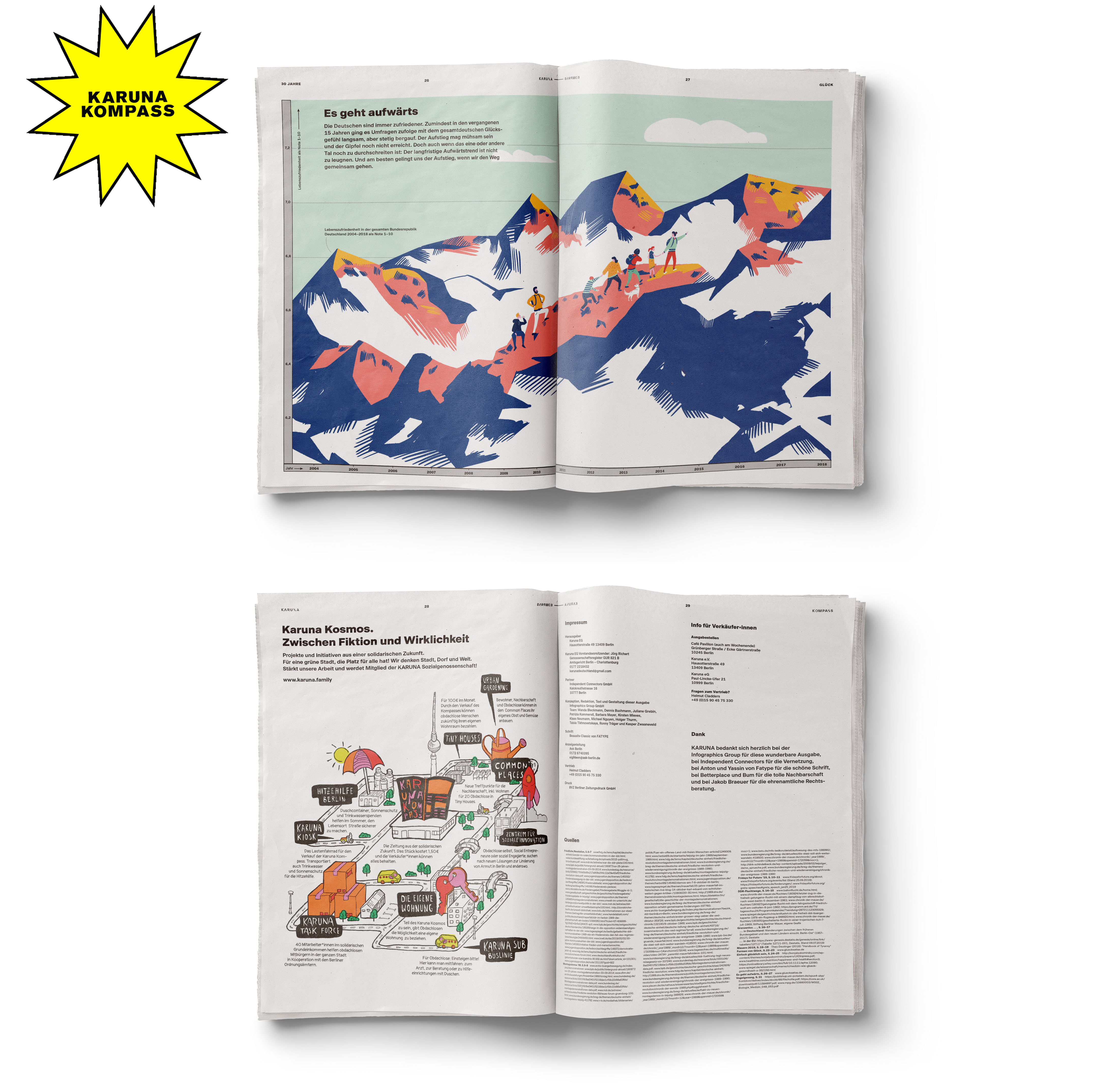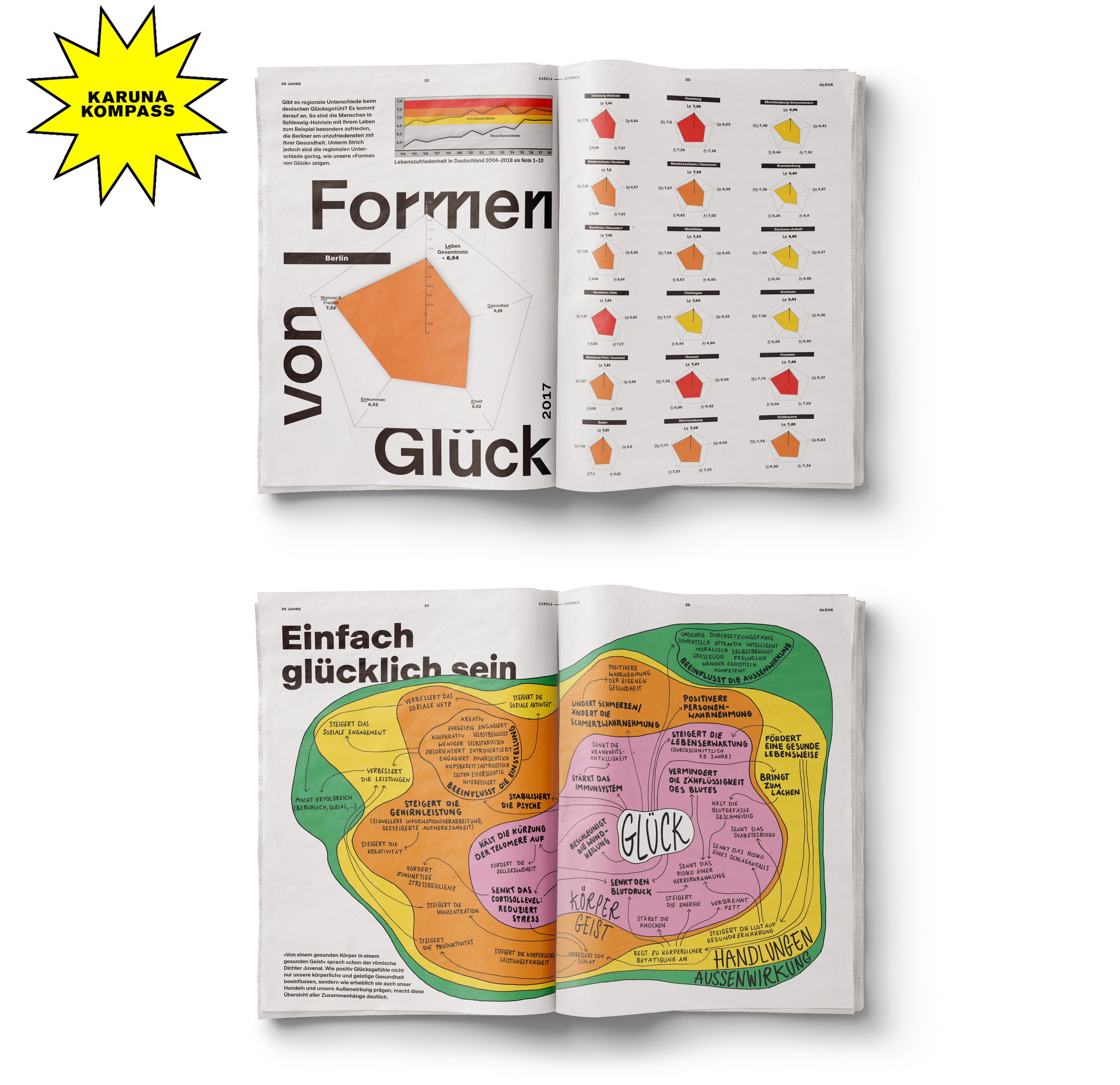 An infographic project with the Berlin street magazine KARUNA KOMPASS at Infographics Group, created to mark the 30th anniversary of the fall of the Berlin Wall. The publication explores a range of topics related to this historic milestone, including the Monday demonstrations, creative escape methods from the DDR, migration patterns in and out of Germany, existing walls around the world, the happiness index across German federal states, the impact of happiness on individuals, and the evolution of German satisfaction levels from the early 2000s to the present.