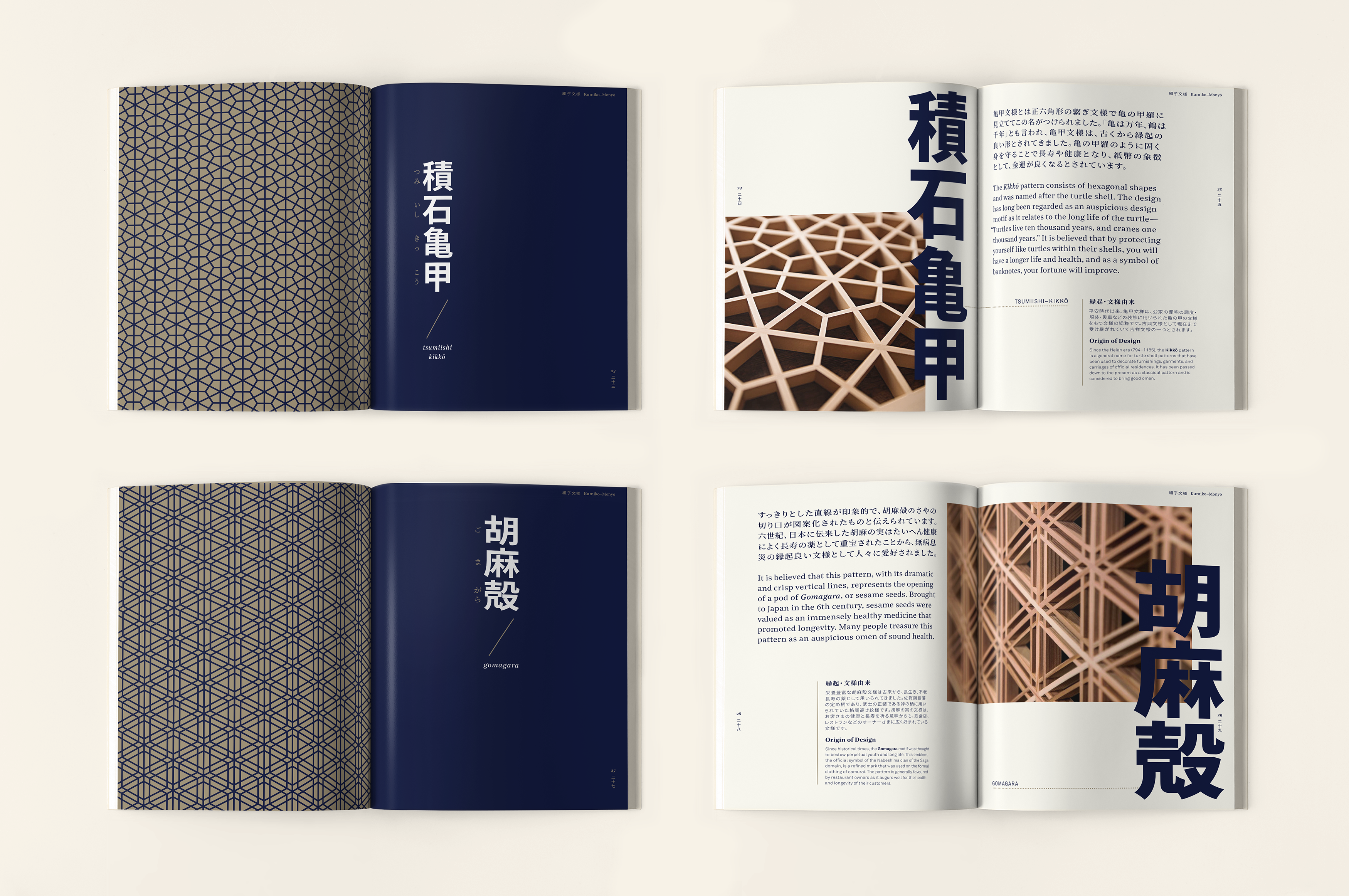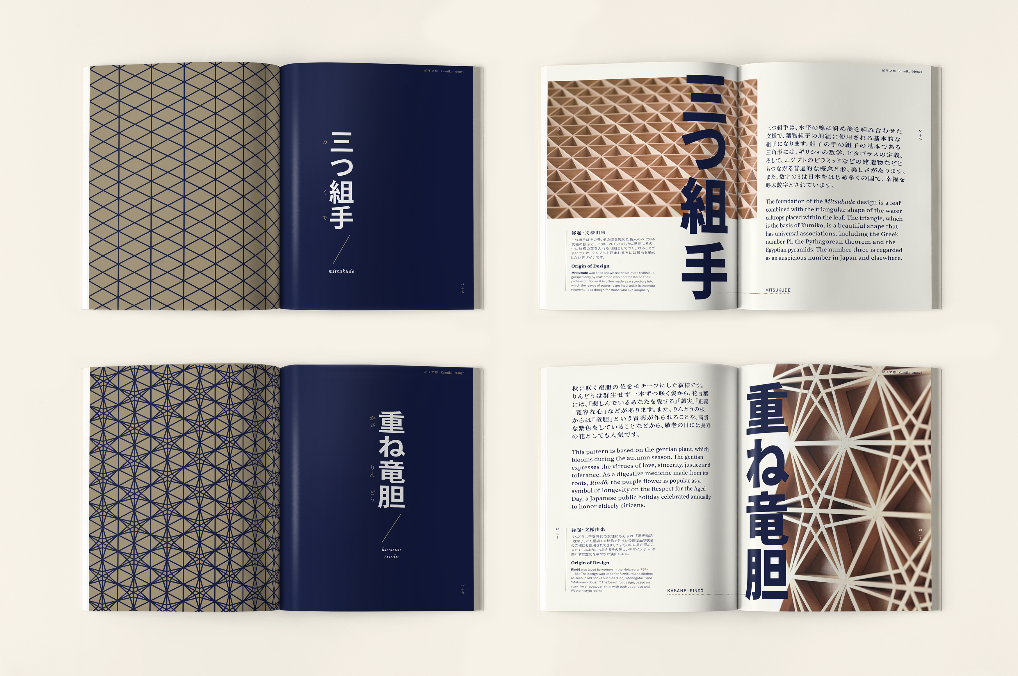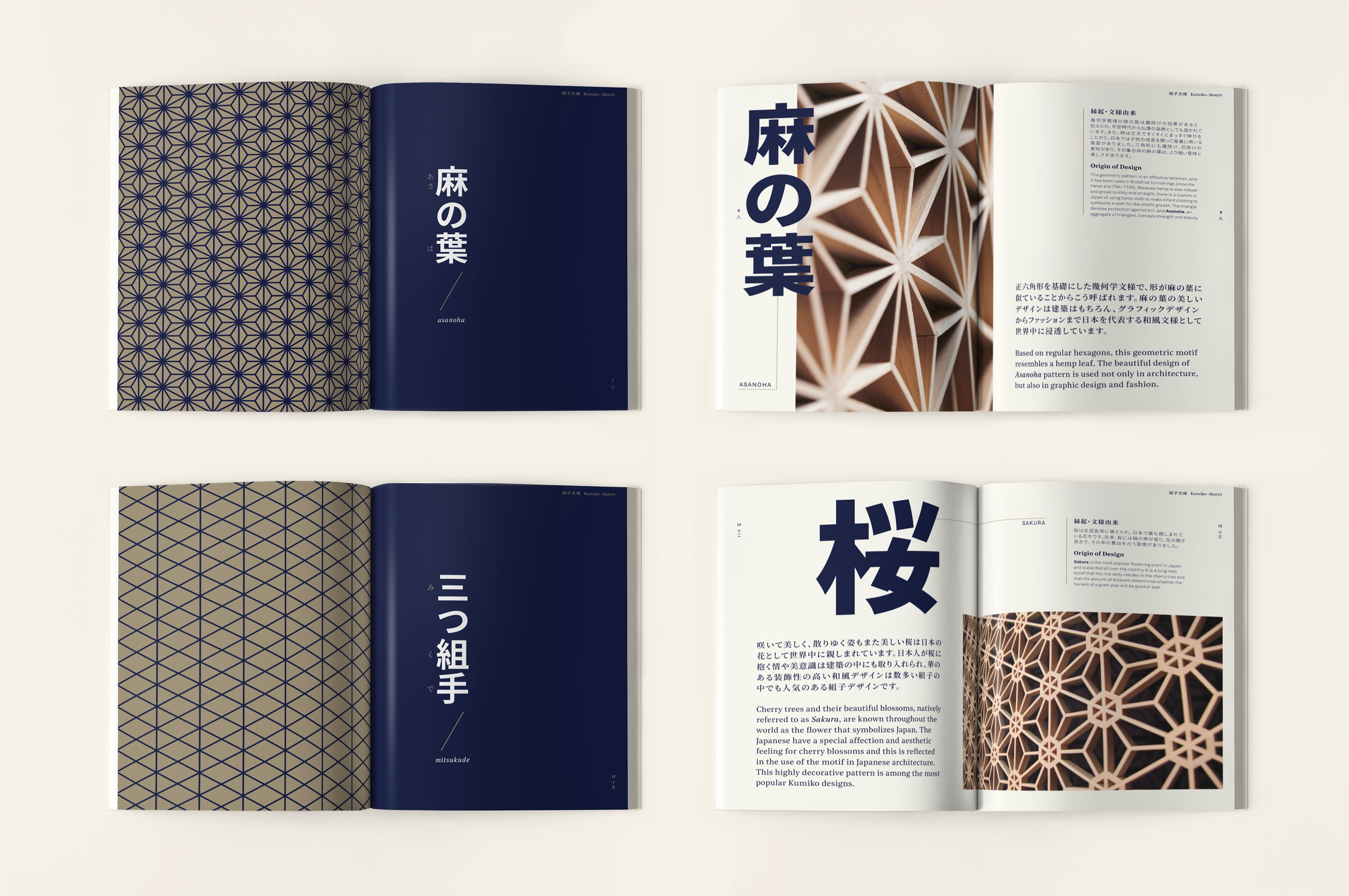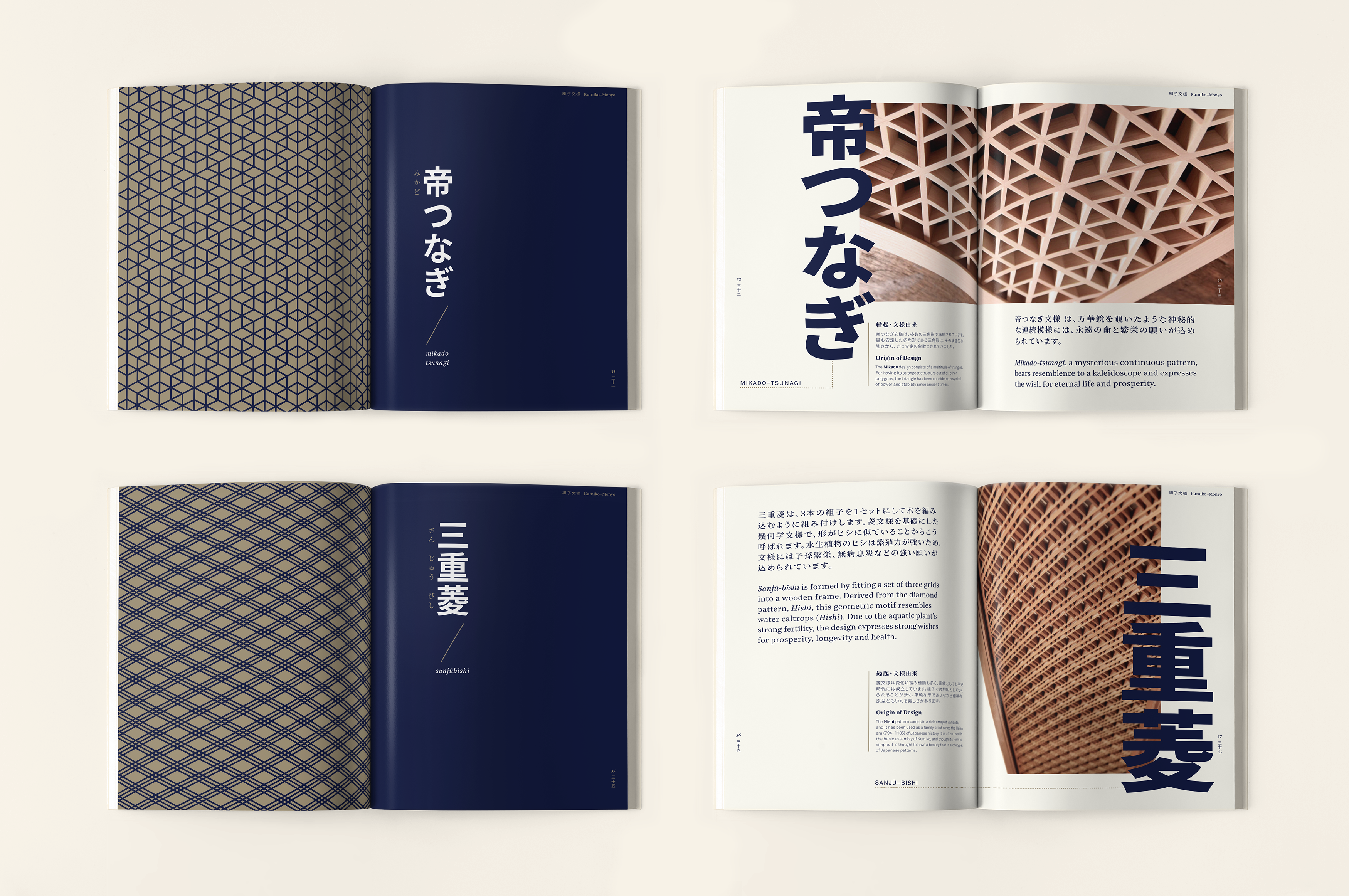 For the editorial design, I researched the unique methods of setting and laying out Japanese text alongside English, carefully balancing both languages. I developed a modular layout system, applying it consistently throughout the book to echo the precision and structural harmony seen in Kumiko craftsmanship, where each wood element aligns seamlessly within the pattern.