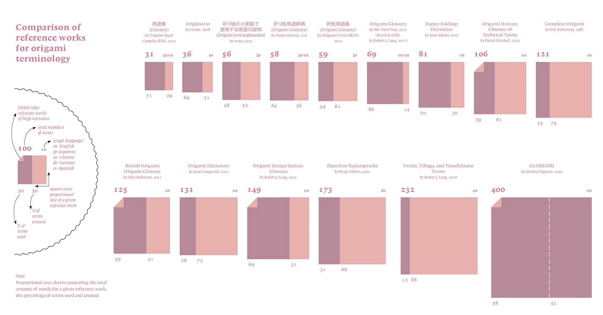 GLOSS/ORI catalogs over 400 terms, drawn from 14 reference works in various languages as well as insights from an online origami Discord community and conversations with established origamists. 58% of entries were adapted and expanded from existing sources, with 42% reflecting my own original research. Each term is categorized and subcategorized, featuring clear definitions, etymological insights, and contextual details.