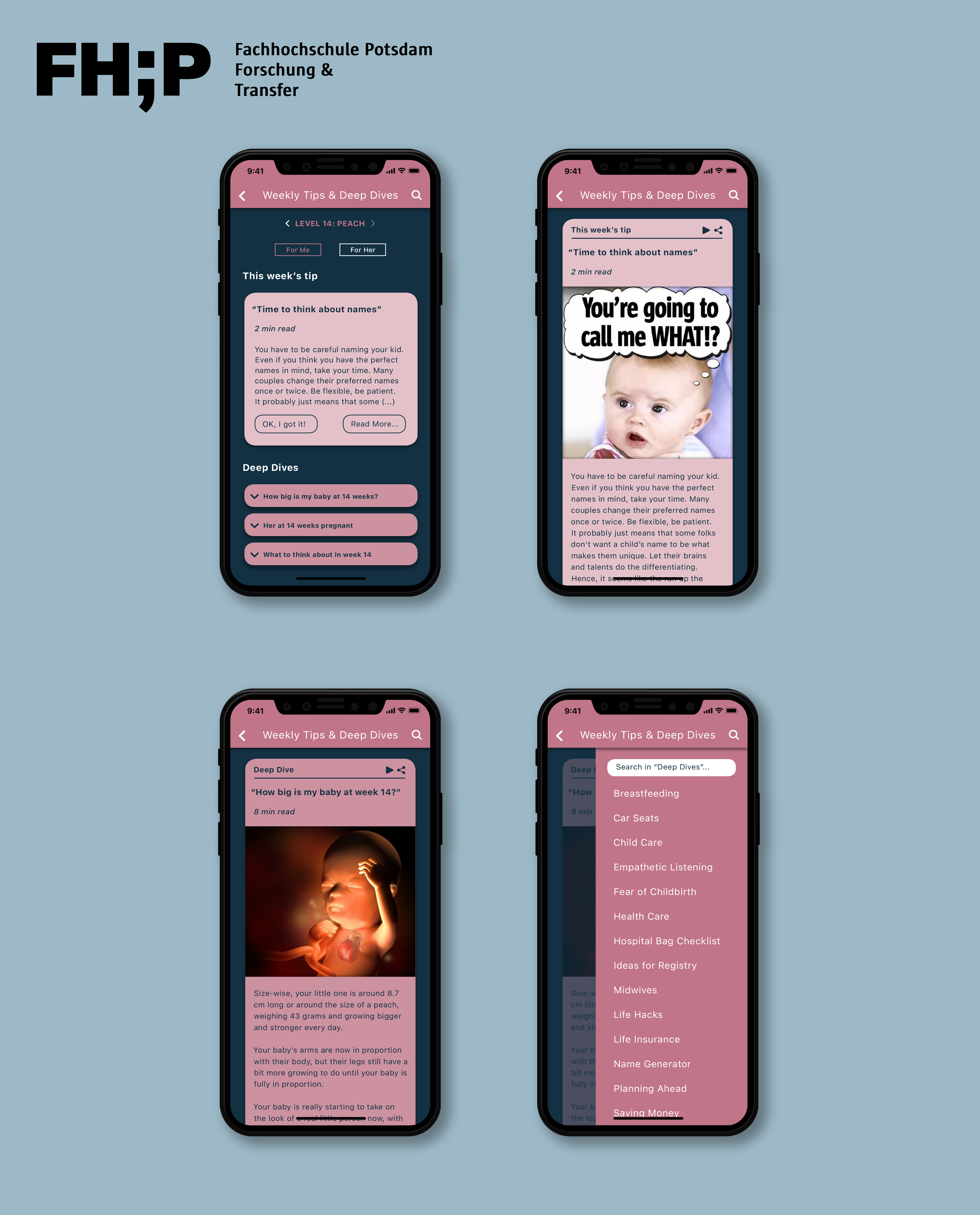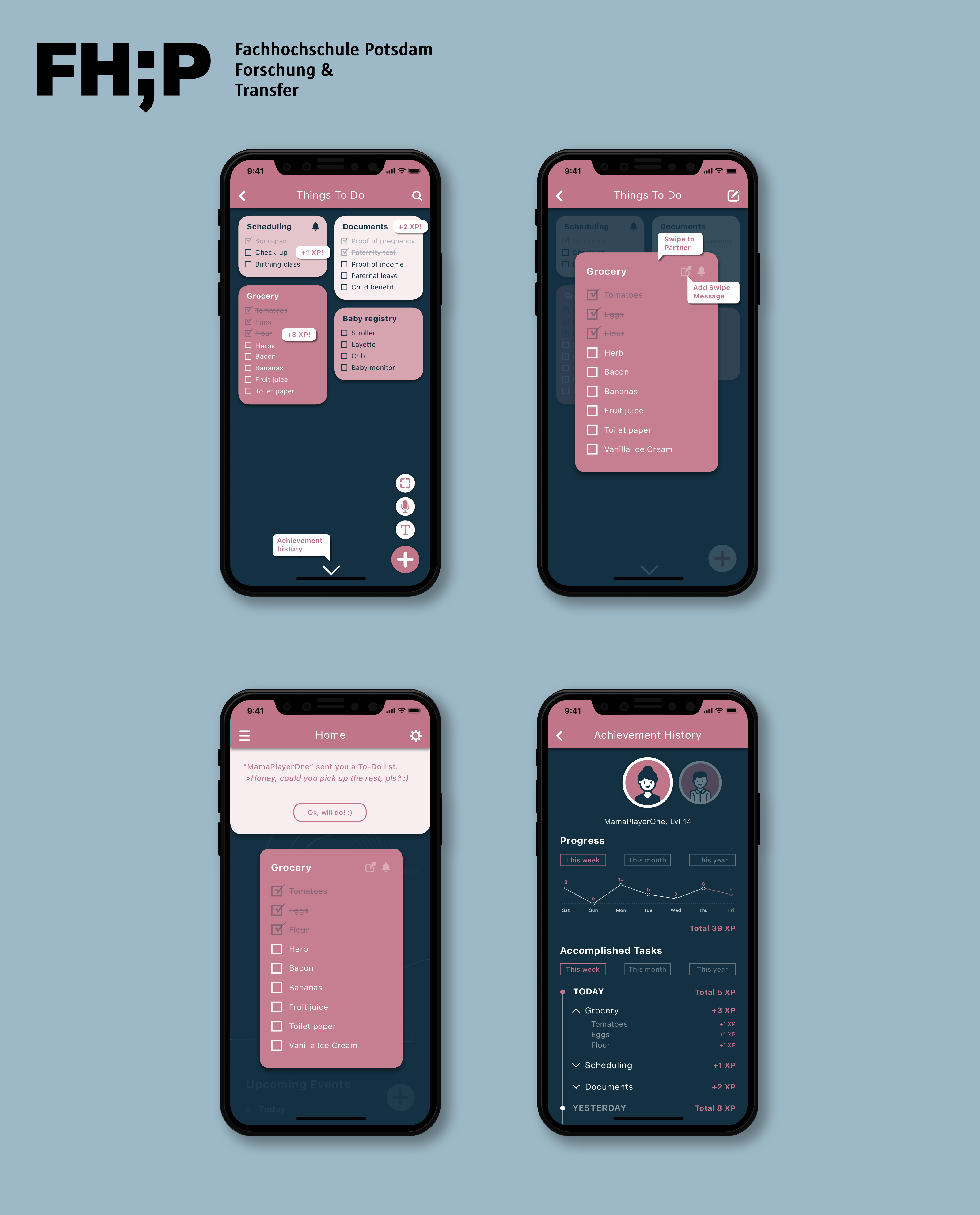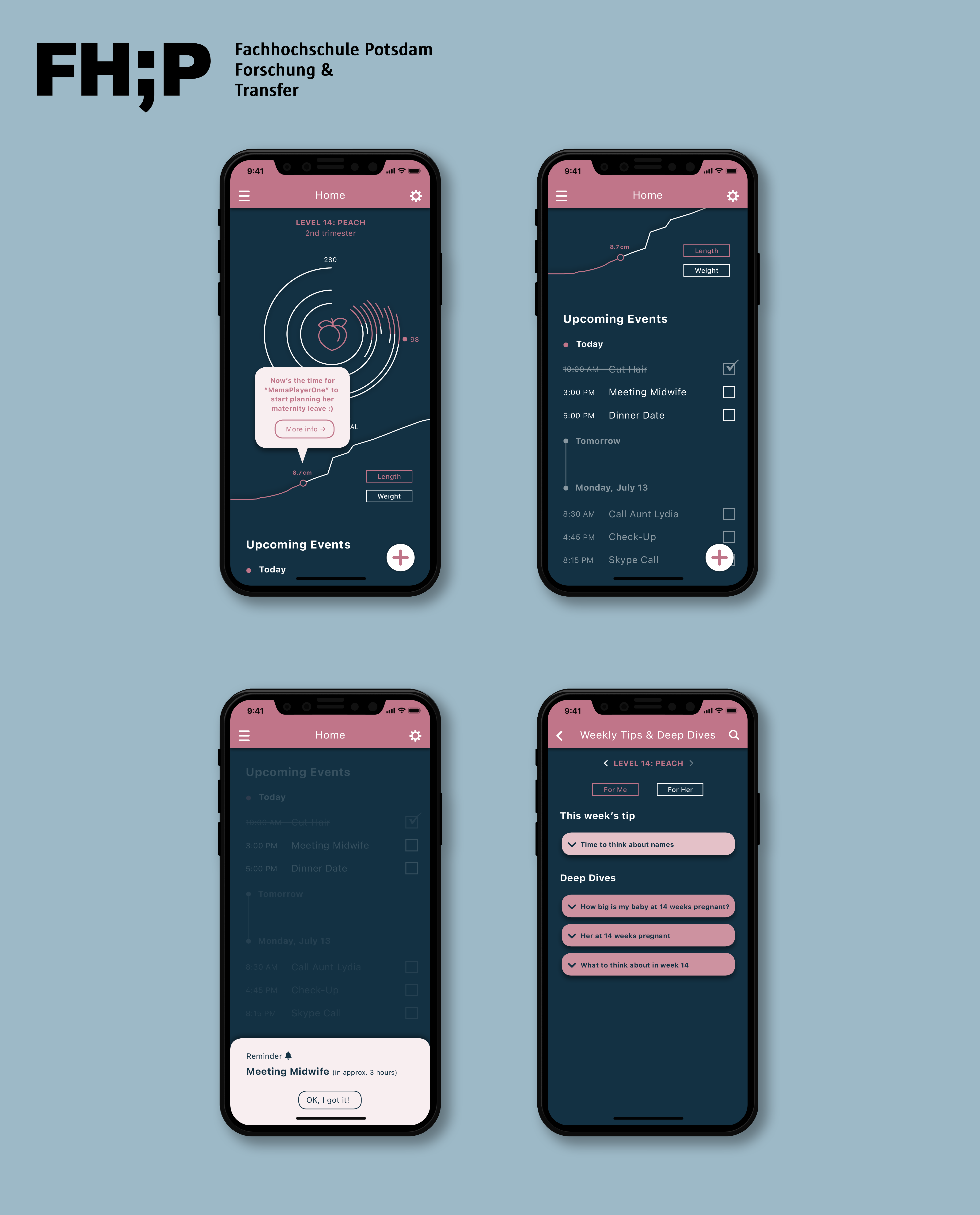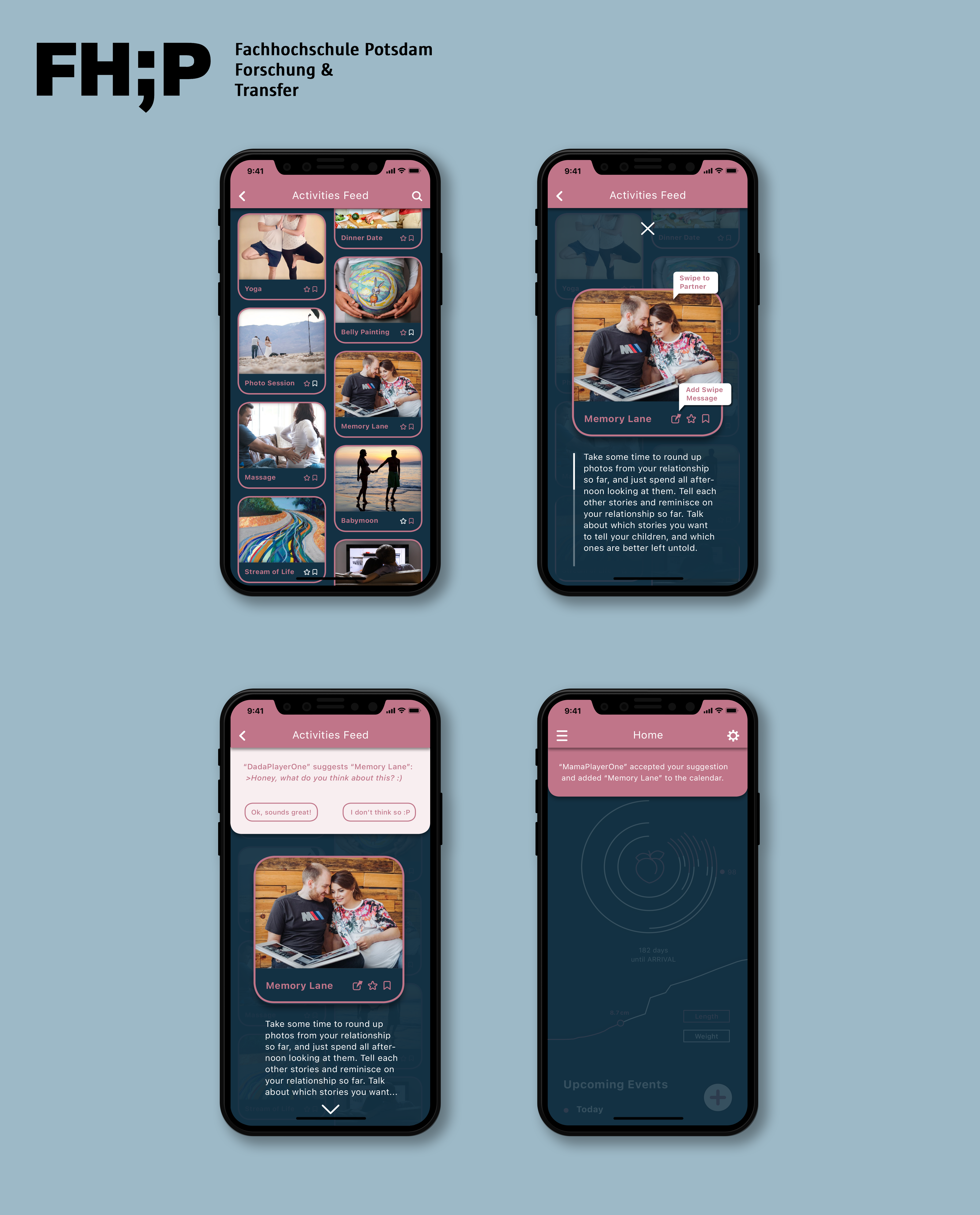A mobile app concept developed as part of a research project at Fachhochschule Potsdam, designed to guide and support parents-to-be throughout pregnancy. Using gamification, the app provides tailored information for each stage of thepregnancy, offering weekly tips, strategies for effective communication, and resources for parenting preparation. Parents can organize tasks easily, track personal achievements, and access a curated list of shared activities to deepen their relationship. The aim was to address psychological challenges, helping to bridge gaps in prenatal care and ensure a more supported, joyful journey into parenthood.