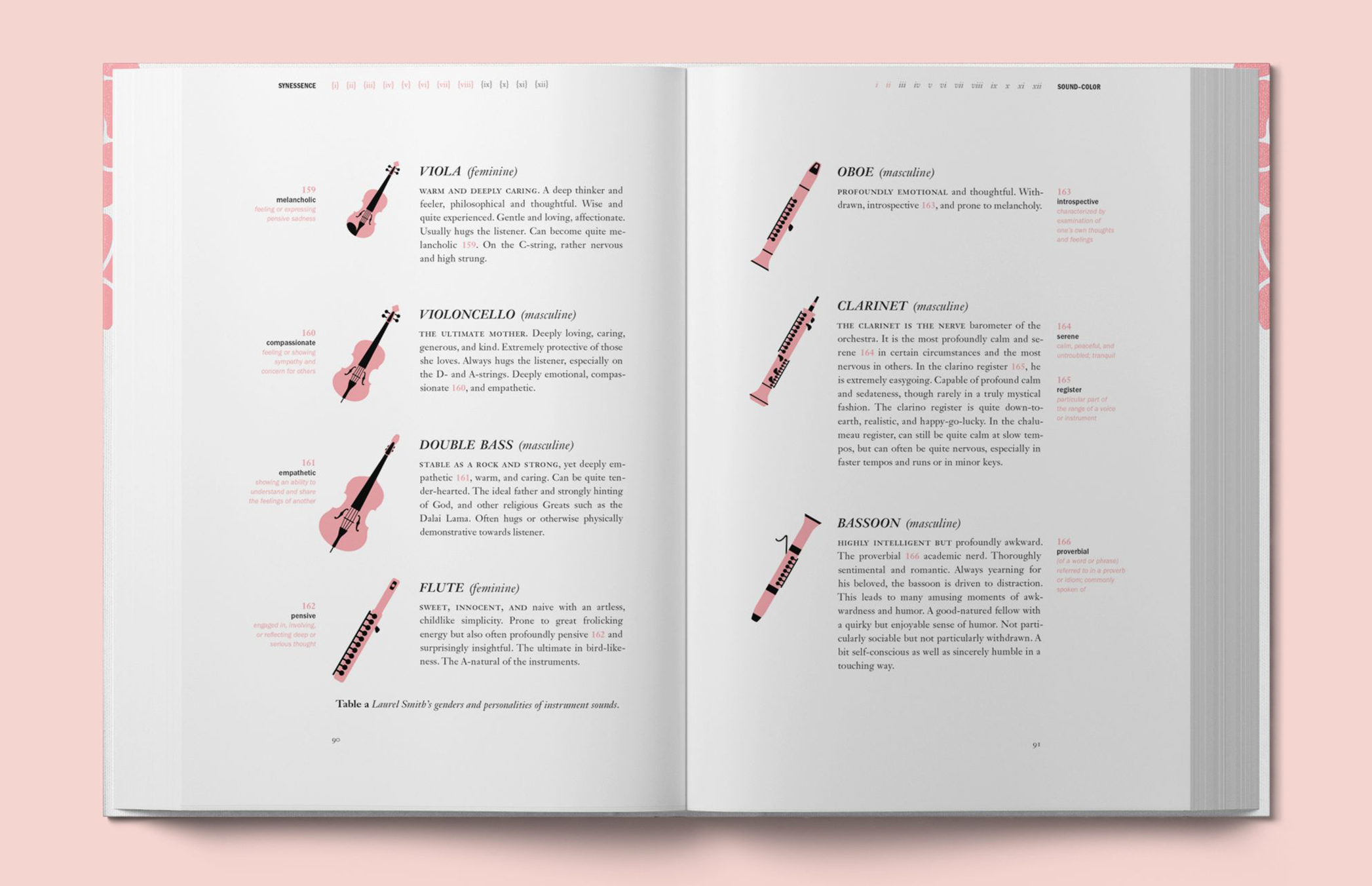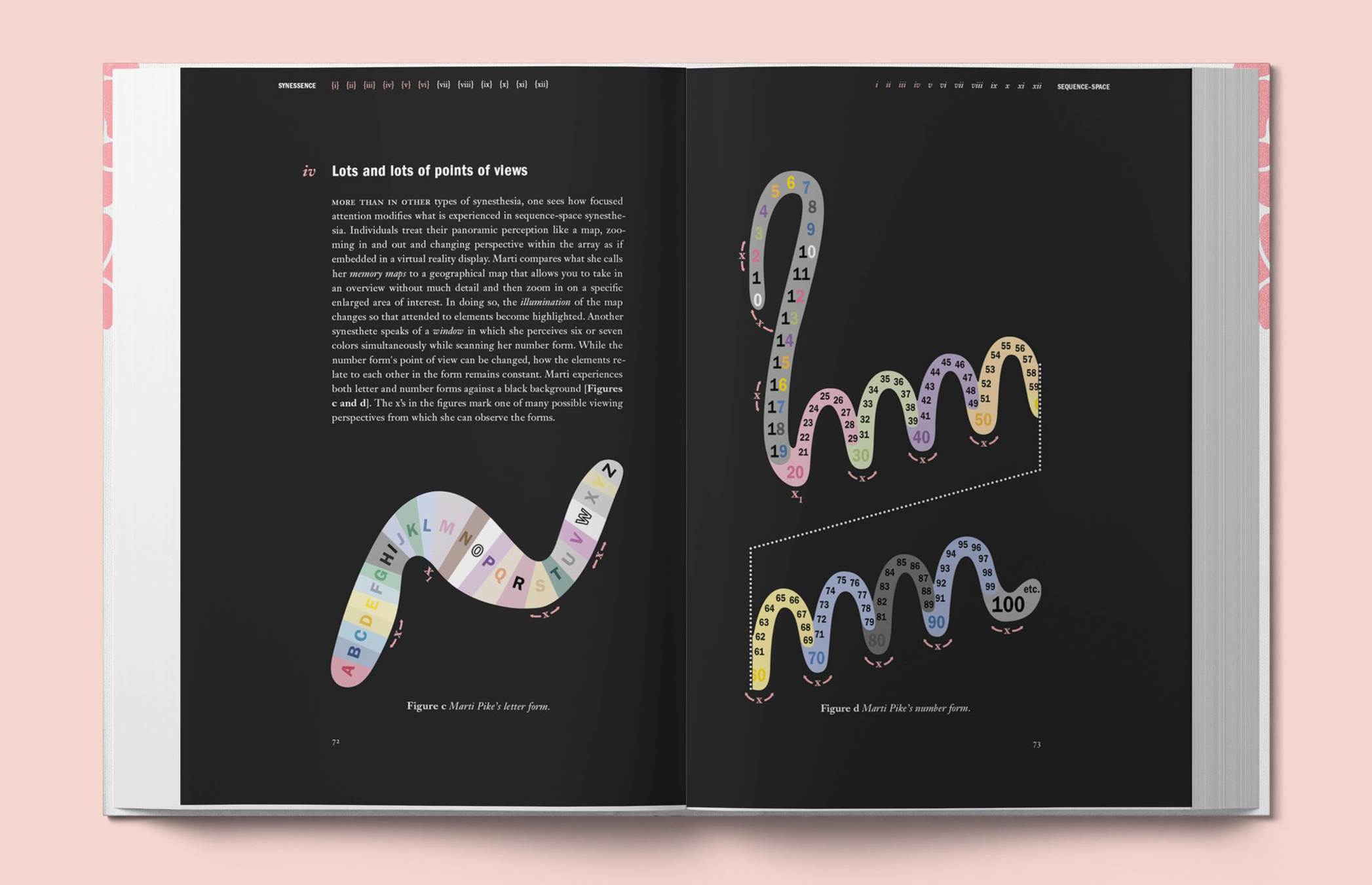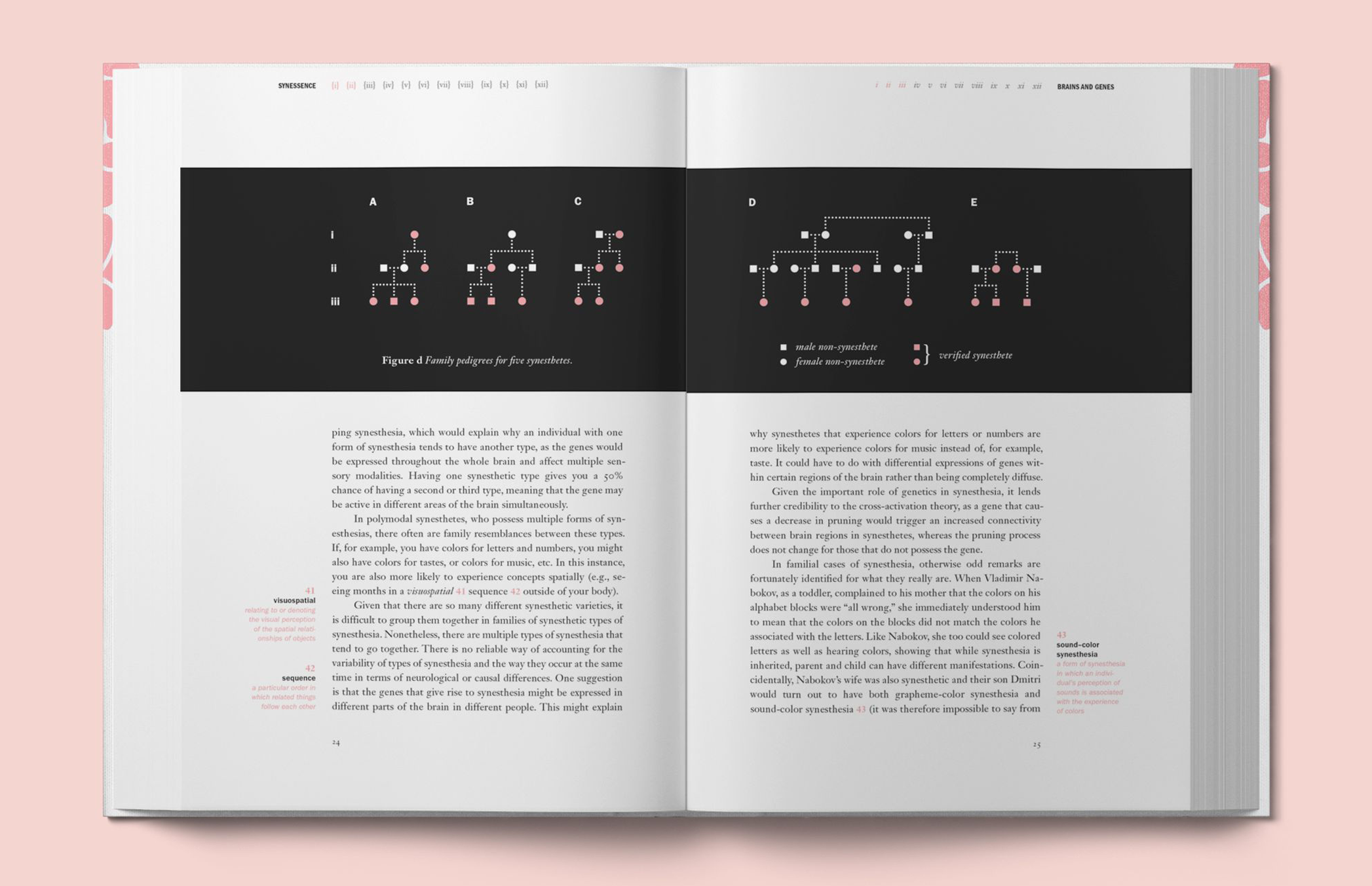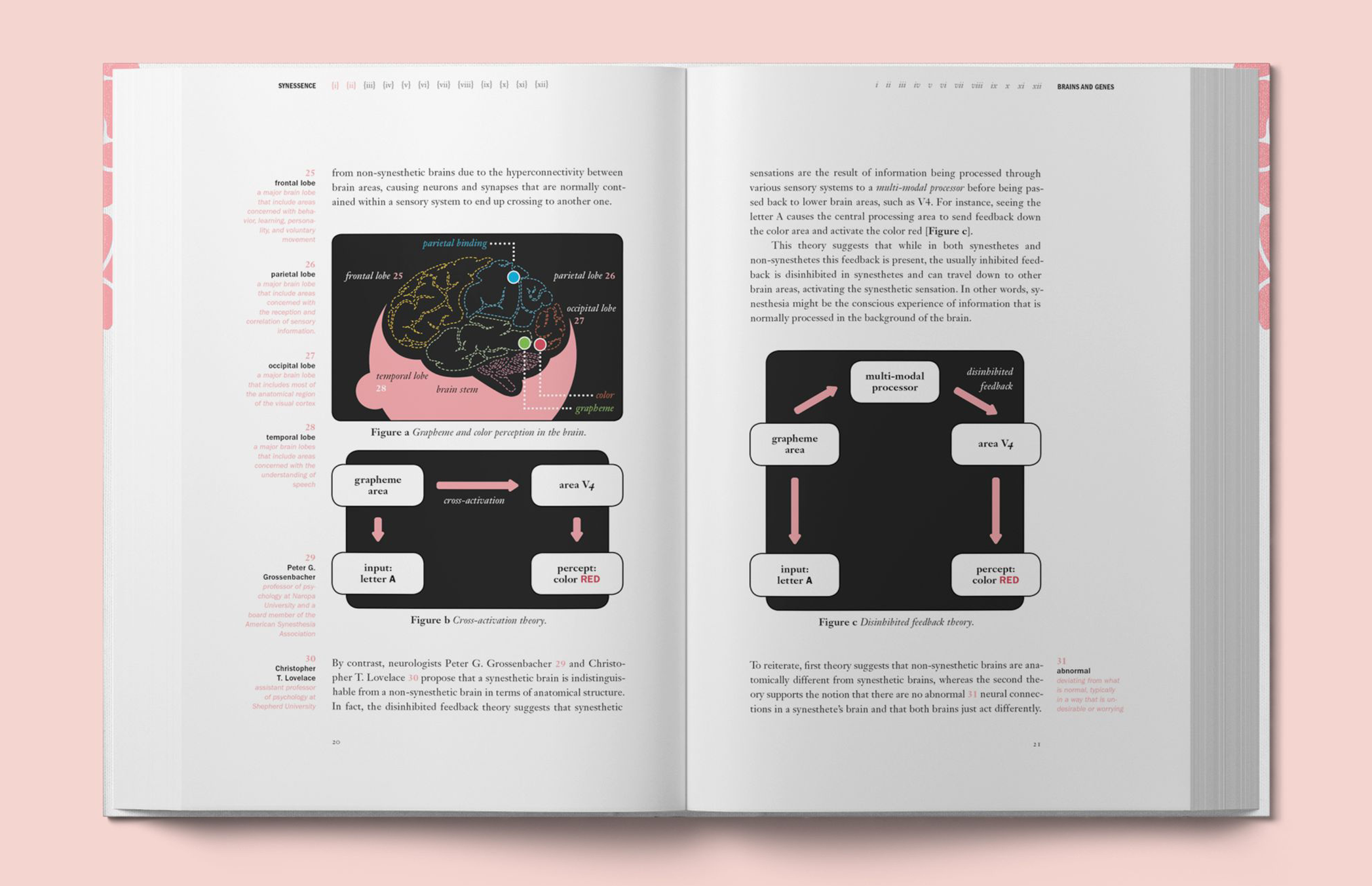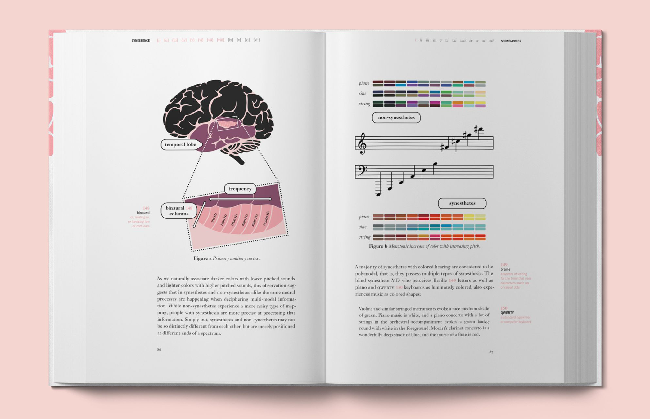 The content draws from a blend of scientific papers, literature on synesthesia, and news articles featuring anecdotal experiences from synesthetes. To enhance the visual narrative, I redesigned existing infographics and created new ones, providing a visually engaging way to complement and contextualize the information. Additionally, I crafted a visual navigation bar at the top for easier orientation and seamless navigation throughout the book. Extensive annotations were added to clarify terms and provide further context, ensuring the material is accessible and informative.