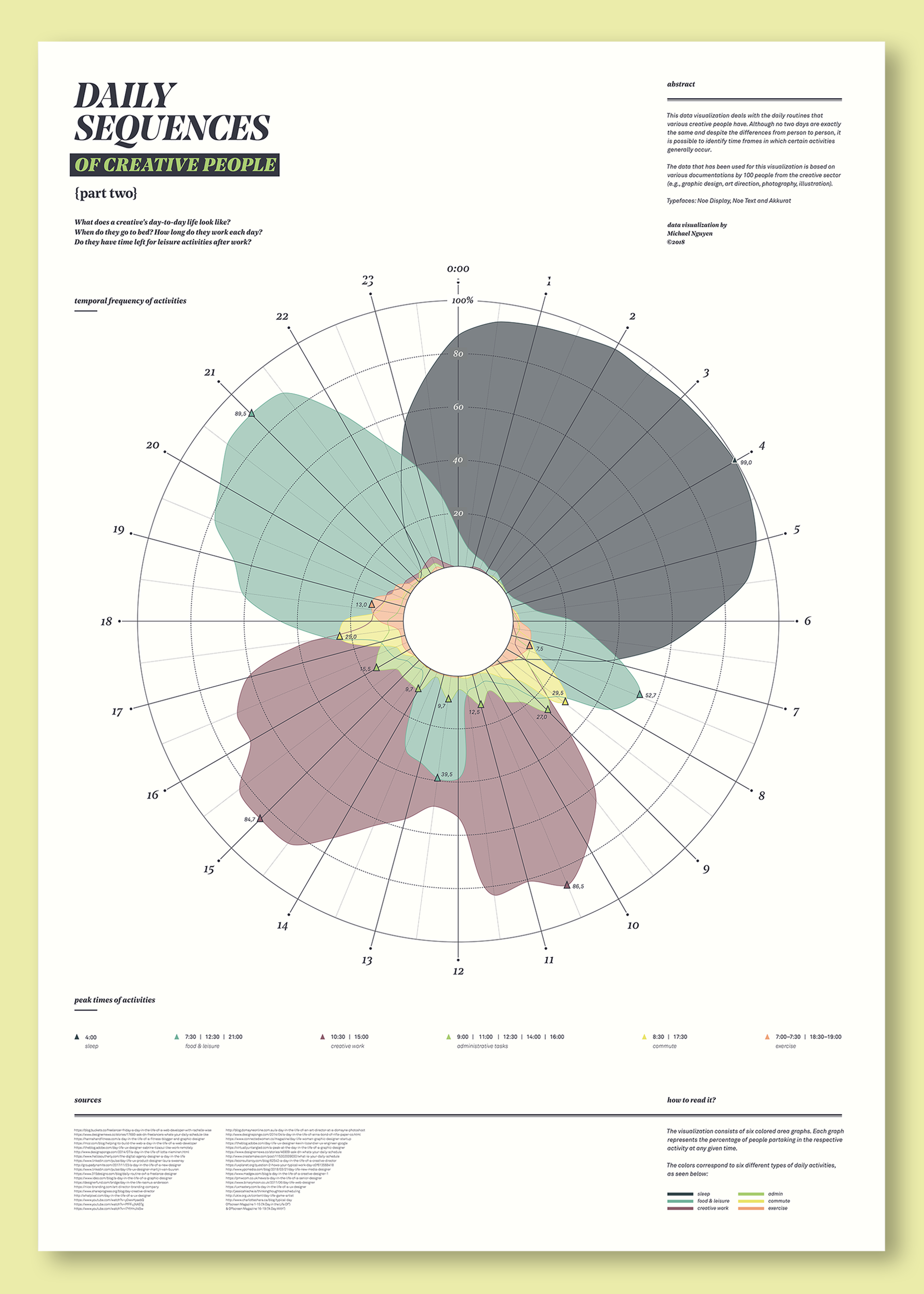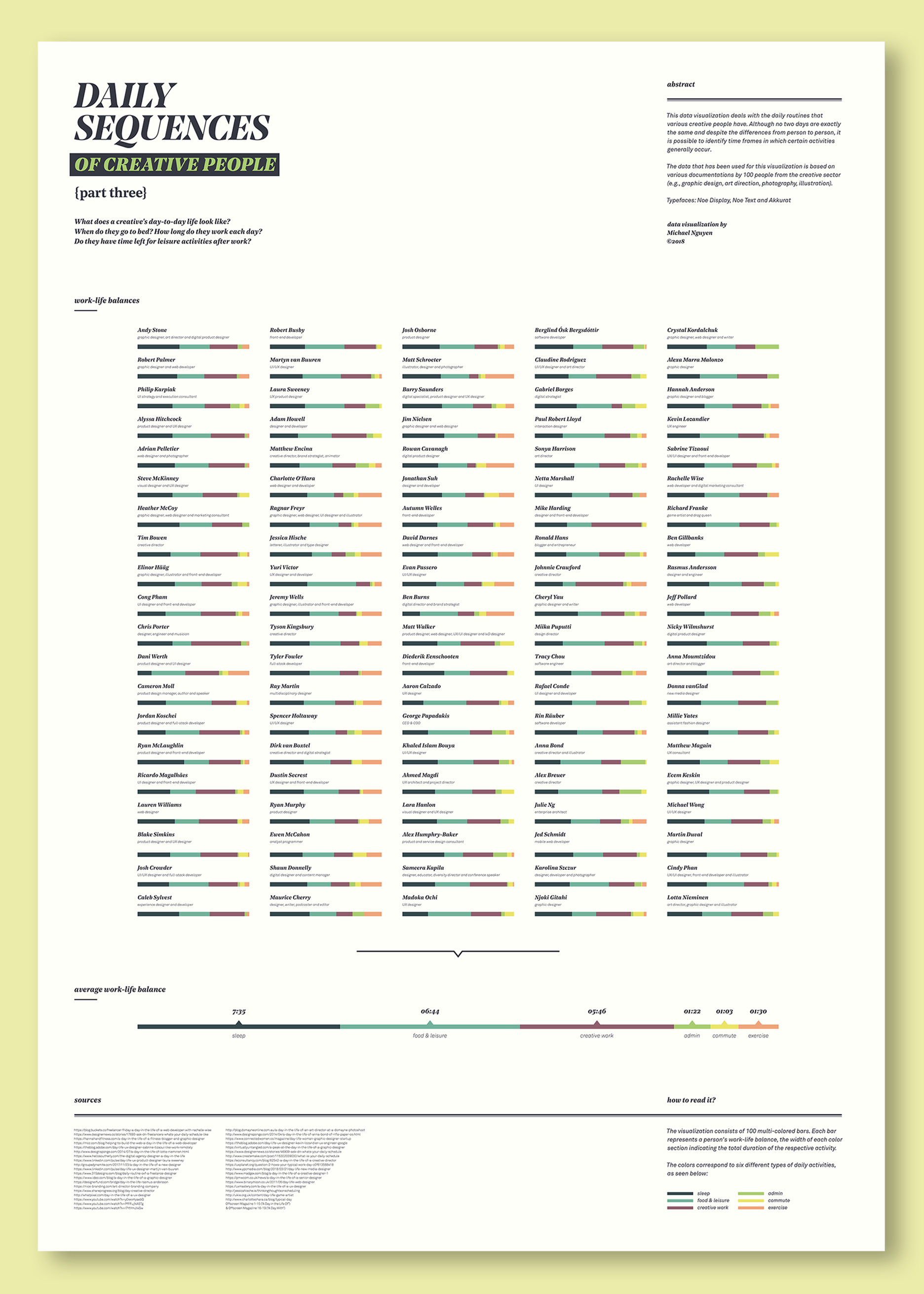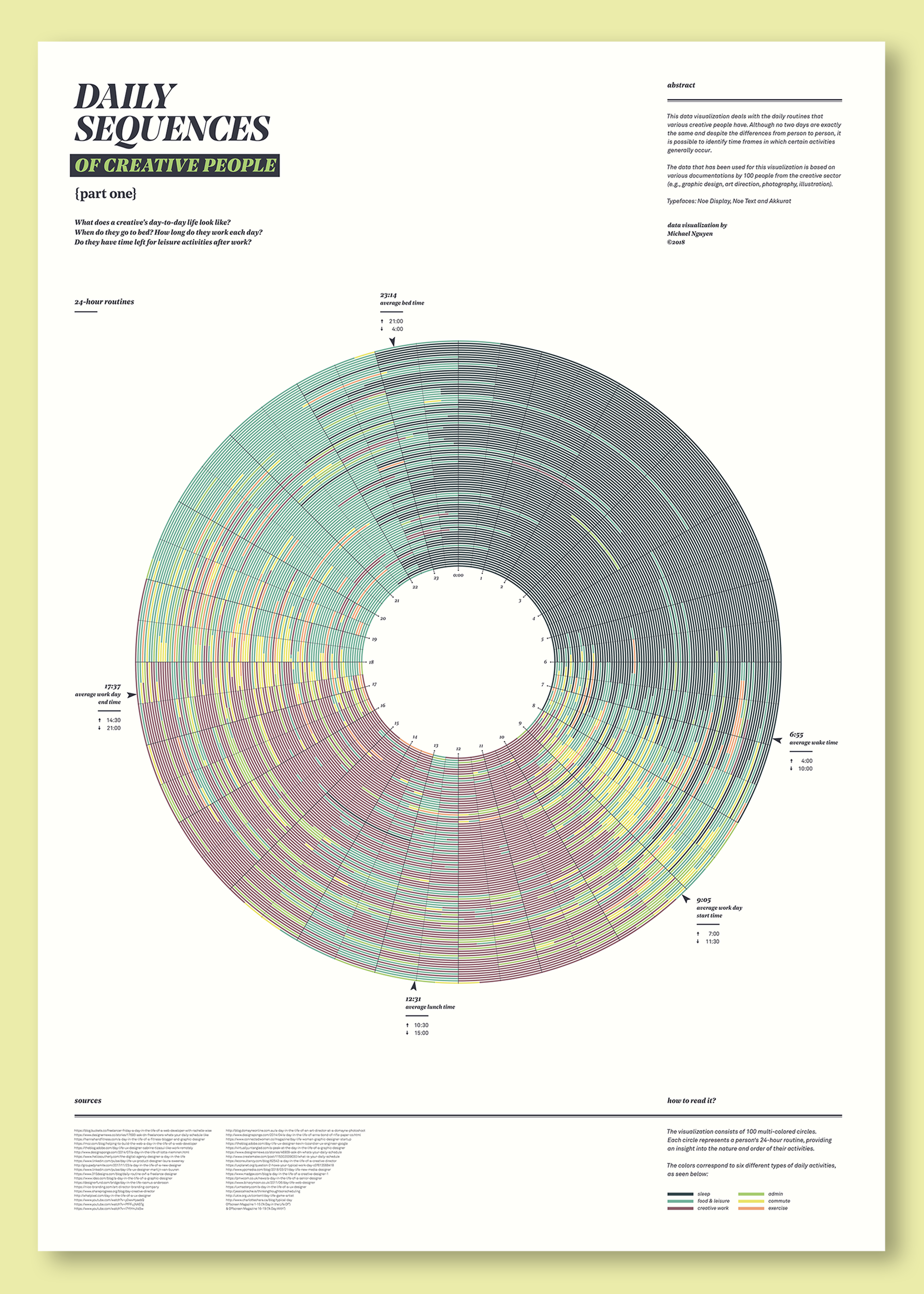 A data visualization poster series exploring the daily routines of 100 creatives, revealing patterns and typical time frames for specific activities.