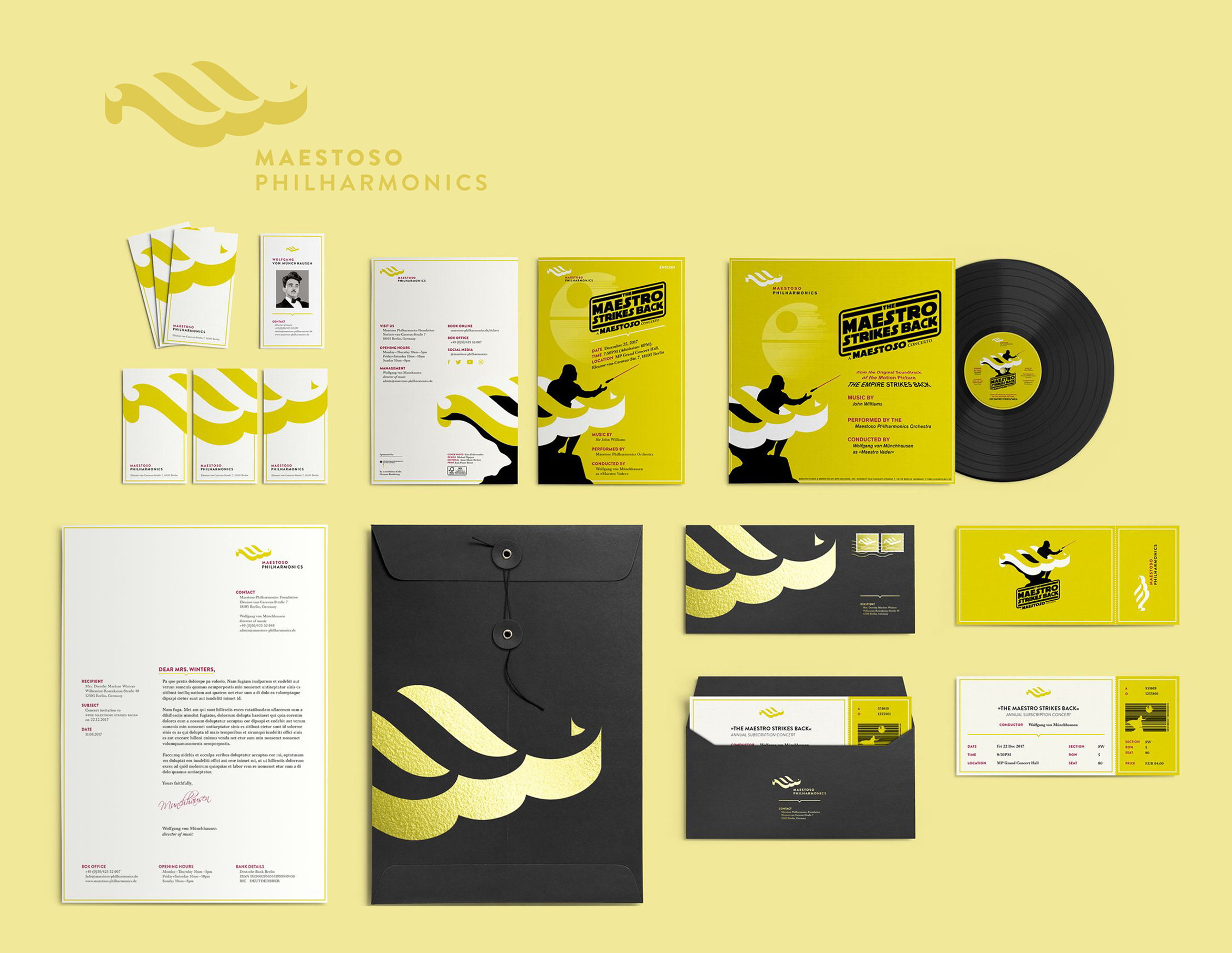The branding suite included business cards, letterhead, event flyers, concert tickets with envelopes, vinyl packaging, and custom manuscript paper. Each element was designed to convey professionalism and artistic refinement, aligning with the collective’s mission and appeal.