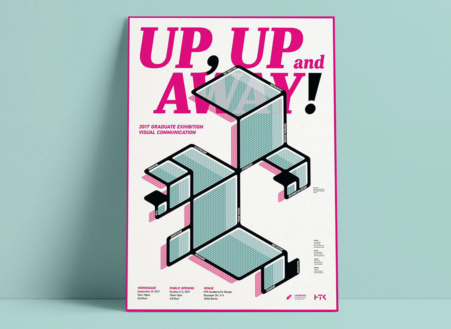 The core visual features a geometric, isometric figure, with various planes representing key elements of the HTK Academy curriculum, such as art direction, editorial design, typography, branding, advertising, packaging, illustration, animation, film, UX/UI design, and information design. This concept symbolizes the journey from student to graduate, with each plane reflecting the skills and knowledge acquired throughout the program.